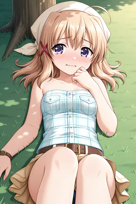 casual,yellow bandana,yellow headwear,aqua shirt,strapless shirt,plaid shirt,pocket,buttons,yellow skirt,brown belt,belt buckle,miniskirt,plaid skirt,pleated skirt,shoes,sandals,brown footwear,