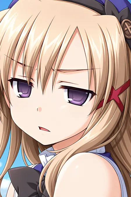 komatsu asuka,1girl,solo,purple eyes,light brown hair,long hair,hair between eyes,ahoge,messy hair,hair ribbon,x hair ornament,