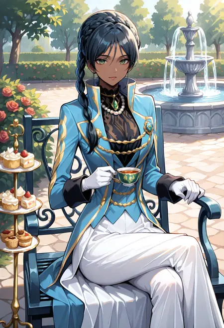 복장 1: 유니폼, 검은 머리, 군복, 망토, 군사, 땋은 머리, 긴 머리, 단일 땋은 머리, 긴 소매, 검은 피부, 검은 피부를 가진 여성, 장갑, 치마, 파란 머리