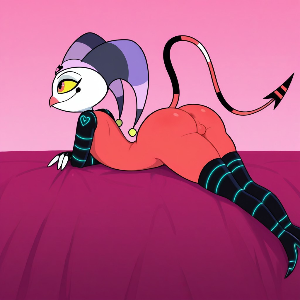 Fizzarolli, fizzarolli \(helluva boss\), 1boy, demon anthro, yellow sclera, red nose bump, red eyes, white face, red and white body, sharp teeth, demon tail, robotic arms, robotic limbs, robotic heels, robotic enhancements, robotic legs, robotic shoulders, white fingers, jester cap, jester like hat,