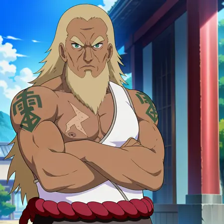 | 训练词汇 | 3raikage, green eyes, blonde hair, long hair, facial hair, beard, dark skin, dark-skinned male, muscular, muscular male,已复制! tattoo, shoulder tattoo,已复制! scar, scar on breasts,已复制! pants, black pants, rope, red rope, toeless footwear, shirt, white shirt, sleeveless, sleeveless shirt,已复制! |