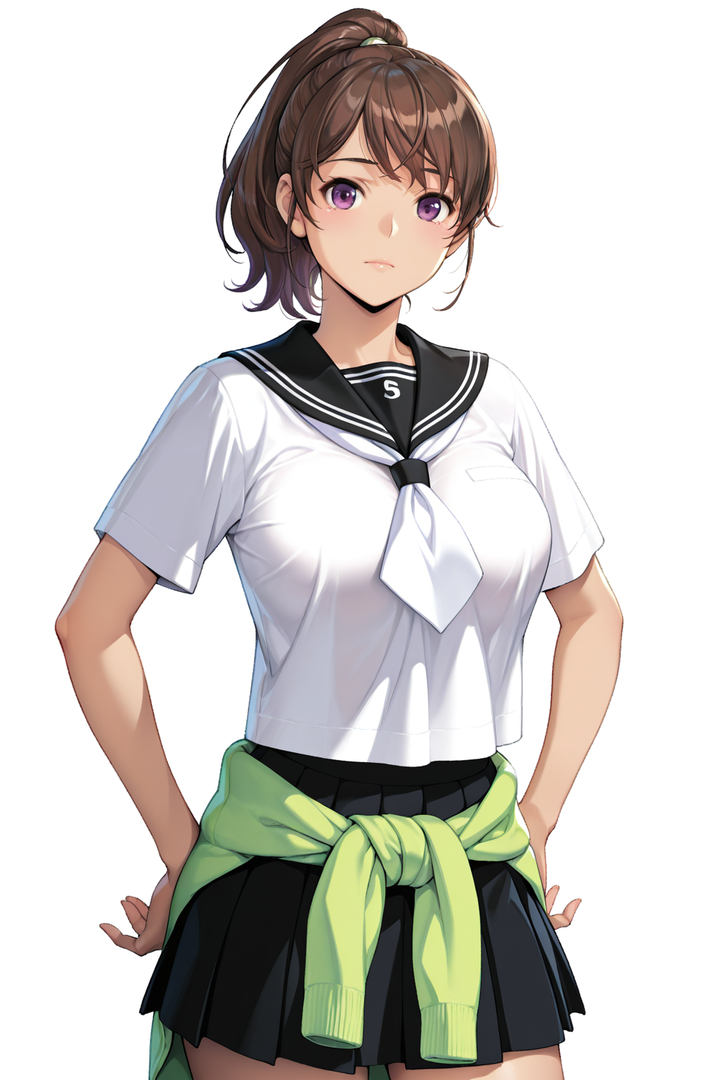 outfit:school uniform,serafuku,white shirt,white neckerchief,black sailor collar,clothes around waist,black pleated skirt