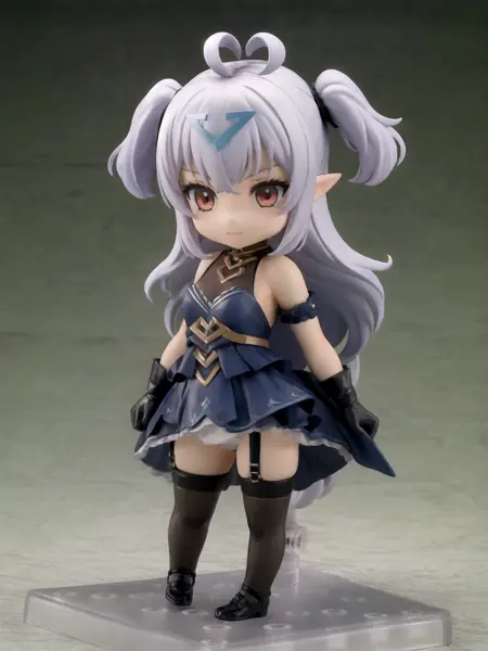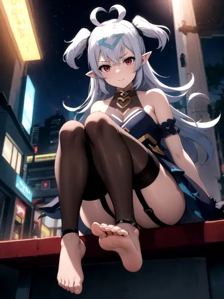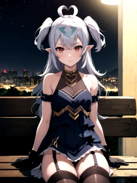 dsdili, red eyes, long hair, two side up, hair ornament, pointy ears, ahoge, small breasts, blue dress, thighhighs, garter straps, gloves