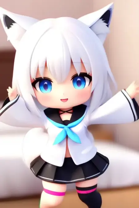 sample prompt:Shirakami Fubuki, anime-style girl. The image features an anime-style character with white hair. The hair is styled in a straight manner, with some strands falling over the shoulders. The character has large, pointed ears that resemble those of a fox or cat, indicating they might be a fox spirit or similar creature.The character's eyes are blue, and they have a gentle expression on their face. They are wearing a black and white outfit that includes a high-collared shirt with a blue ribbon tied around the neck. The shirt is paired with a black skirt that has a keyhole cutout at the front. The character is also wearing black thigh-high stockings with a pink band at the top. (she is dancing:2.5), (chibi Nendoroid:3.5) in bedroom.