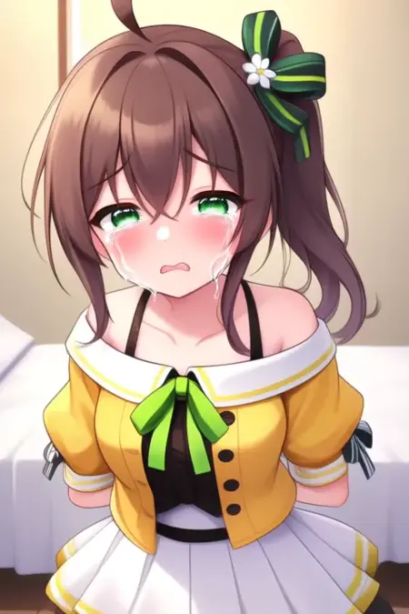 触发词:夏色祭,动漫风格女孩。图像中为一位动漫风格角色,棕色头发扎成双马尾,每条马尾上系着绿色丝带。角色拥有绿色眼睛,身穿黄色夹克,内搭白色衬衫,衣领处系着绿色蝴蝶结。夹克配有黑色纽扣和白色衣领。服装还包括短袖上衣,袖子呈蓬松状,下身穿一条白色短裙,裙长刚过膝盖。