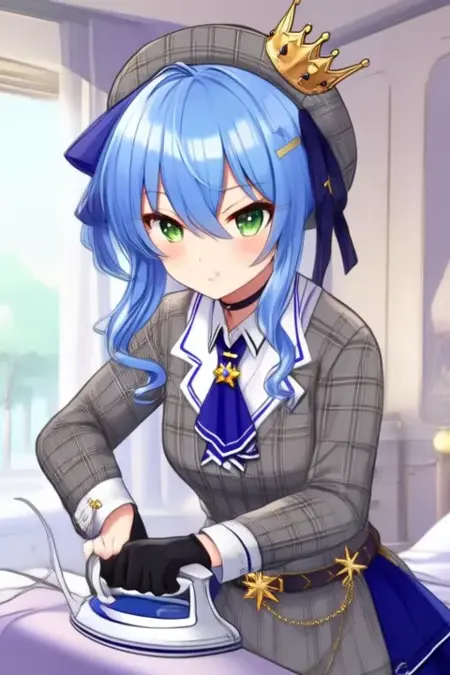 触发词:Hoshimachi Suisei anime-style girl。图像为一位动漫风格的角色,左侧梳着蓝色侧马尾,绿色眼睛,身穿校服:灰色格子西装外套搭配白色衬衫与蓝色领带,同色系灰色短裙,以及黑色手套。角色头部佩戴王冠,颈饰上悬挂星形吊坠。