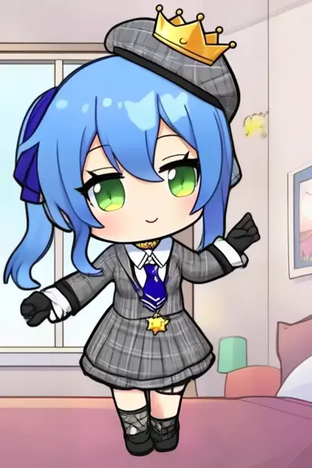 示例提示词:Hoshimachi Suisei anime-style girl。图像为一位动漫风格的角色,左侧梳着蓝色侧马尾,绿色眼睛,身穿校服:灰色格子西装外套搭配白色衬衫与蓝色领带,同色系灰色短裙,以及黑色手套。角色头部佩戴王冠,颈饰上悬挂星形吊坠。 (她正在跳舞:2.5), (Q版Nendoroid:3.5) 在卧室中。