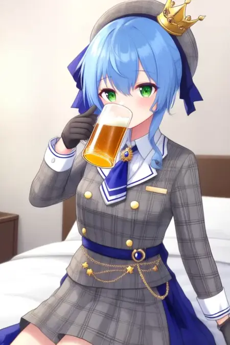 샘플 프롬프트: Hoshimachi Suisei 애니메이션 스타일 소녀. 이미지는 왼쪽에 사이드 펜테일로 스타일링된 파란 머리카락을 가진 애니메이션 스타일 캐릭터를 특징으로 합니다. 캐릭터는 녹색 눈을 가지고 있으며, 흰 셔츠에 파란 넥타이, 매치하는 회색 치마, 검은 장갑을 갖춘 교복인 회색 체크 무늬 블레이저를 입고 있습니다. 캐릭터는 머리에 왕관과 별 모양 펜던트가 달린 목걸이를 착용하고 있습니다. (그녀는 춤추고 있음:2.5), (치비 넌도로이드:3.5) 침실에서.