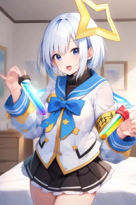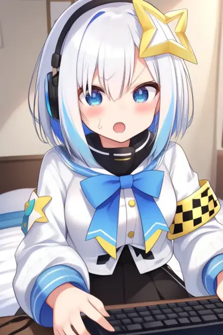 触发词:Amane Kanata,动漫风格女孩。图像中的动漫风格角色拥有短白发,头顶佩戴黄色星星饰品,蓝眼睛,身着白色服装并带有蓝色点缀。服装包括一条带有黄色蝴蝶结的蓝色围巾,以及袖子上有黄色星星的蓝白格子夹克。她身穿水手服风格的装扮,包括白色上衣、黑色短裙和黄黑格子围裙,围裙上写有日文字符。