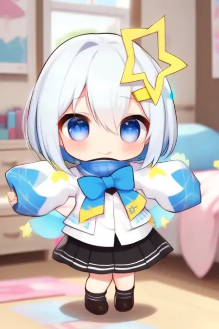示例提示:Amane Kanata,动漫风格女孩。图像中的动漫风格角色拥有短白发,头顶佩戴黄色星星饰品,蓝眼睛,身着白色服装并带有蓝色点缀。服装包括一条带有黄色蝴蝶结的蓝色围巾,以及袖子上有黄色星星的蓝白格子夹克。她身穿水手服风格的装扮,包括白色上衣、黑色短裙和黄黑格子围裙,围裙上写有日文字符。(她正在跳舞:2.5),(Q版Nendoroid:3.5),在卧室中。