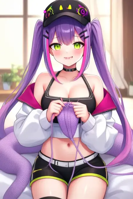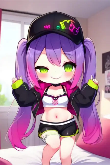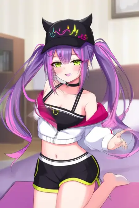 サンプルプロンプト: Tokoyami Towa, アニメ風の少女。画像には、長く流れる紫髪にピンクのハイライトが施されたアニメ風のキャラクターが描かれています。キャラクターは黒いキャップを着用しており、その周囲にはネオンイエローとピンクの装飾が施され、目と口の部分にはスマイルマークが描かれています。目は緑色で、高めのネックラインを持つブラックとホワイトのスポーツブラとマッチングするジャケットを着用しています。ジャケットは開いており、お腹が見えています。また、黒いショーツに黄色のトリムが施されています。 (彼女は踊っている:2.5), (ちびネンドロイド:3.5)、寝室で。