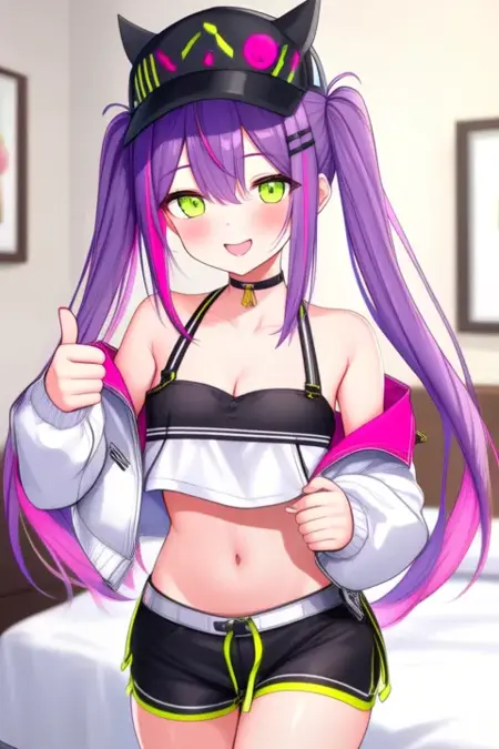 sample prompt:Tokoyami Towa, anime-style girl. The image features an anime-style character with long, flowing purple hair that has pink highlights. The character is wearing a black cap with colorful accents, including neon yellow and pink details around the eyes and mouth area smiley face on it. She has green eyes and is wearing a revealing outfit consisting of a black and white sports bra with a high neckline and a matching jacket. The jacket is open, revealing her midriff, and she is also wearing black shorts with yellow trim. (she is dancing:2.5), (chibi Nendoroid:3.5) in bedroom.