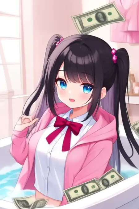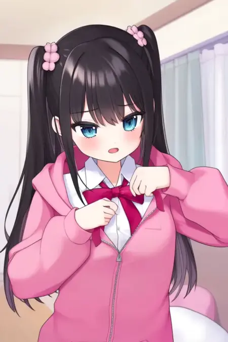 触发词:Kaga Nazuna,动漫风格女孩。图像 featuring 一个动漫风格的角色,拥有长而黑的双马尾发型,蓝色眼睛,外穿粉色连帽衫,内搭白色衬衫并系着红色领结,连帽衫敞开,露出内搭的衬衫。