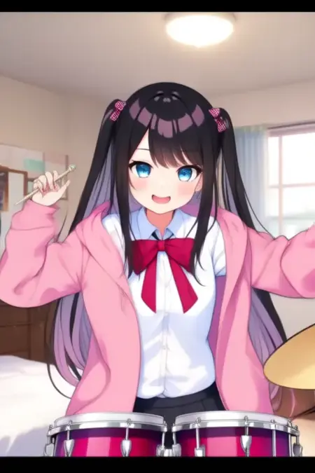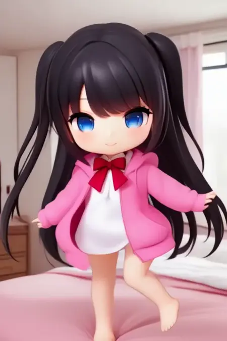 示例提示词:Kaga Nazuna,动漫风格女孩。图像 featuring 一个动漫风格的角色,拥有长而黑的双马尾发型,蓝色眼睛,外穿粉色连帽衫,内搭白色衬衫并系着红色领结,连帽衫敞开,露出内搭的衬衫。 (她正在跳舞:2.5),(Q版Nendoroid:3.5) 在卧室中。
