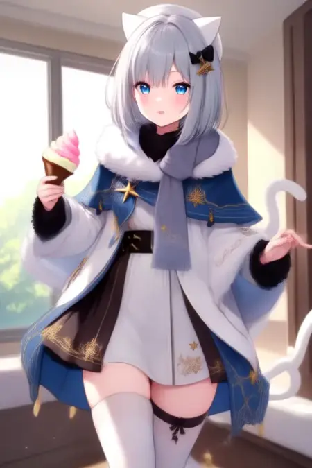 サンプルプロンプト: Kaga Sumire, アニメスタイルの女の子。画像には、銀色の髪を高いポニーテールでまとめ、猫の耳のような形状をしたアニメスタイルのキャラクターが描かれています。目は青色で、白と黒の服にファーのトリムが施されています。服には、胸元に星型のブローチがついたロングコート、ゴールドの星が飾られたスカーフ、そしてマッチングする手袋が含まれています。また、太ももまで届くストッキングにはクロス模様がデザインされており、首には白いスカーフが結ばれ、頭には小さなリボンがついています(彼女は踊っています:2.5)、(ちびネンドロイド:3.5)寝室で。