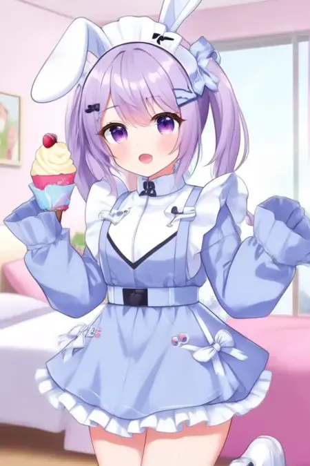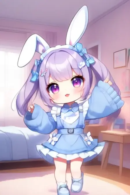 샘플 프롬프트: 토사키 미미, 애니메이션 스타일 소녀. 이미지는 연한 보라색 머리카락을 트윈테일로 스타일링한 애니메이션 스타일 캐릭터를 특징으로 합니다. 큰 표현력 있는 보라색 눈과 분홍빛 볼을 가지고 있습니다. 캐릭터는 가슴에 하트 모양 엠블럼과 흰색 칼라가 있는 연한 파란색 옷을 입고 있습니다. 옷은 주름진 손목이 있는 긴 소매와 허리에 끈이 있습니다. 캐릭터는 토끼 귀와 옷과 매치되는 장갑을 착용하고 있습니다. 또한 허리 높이가 높고 주름진 밑단이 있는 매치된 치마를 입고 있습니다. 옷은 다양한 작은 리본과 활로 장식되어 장난스럽고 환상적인 분위기를 더합니다. (그녀는 춤추고 있음:2.5), (치비 넌도로이드:3.5) 침실에서.