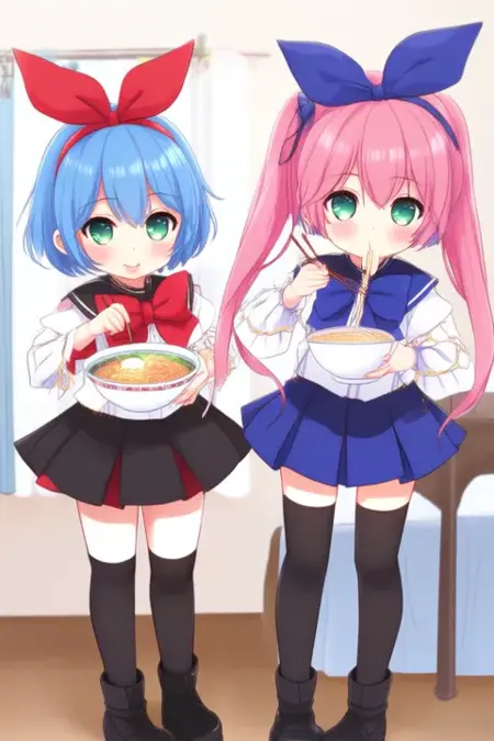 샘플 프롬프트: Omega Sisters, 애니메이션 스타일의 소녀. 이미지는 양쪽에 서 있는 두 명의 애니메이션 스타일 캐릭터를 보여줍니다. 왼쪽 캐릭터는 짧은 파란 머리에 빨간 리본을 묶고, 빨간색과 흰색 옷에 검은 치마, 검은 부츠, 빨간 넥타이를 착용하고 있으며, 눈은 녹색입니다. 오른쪽 캐릭터는 긴 분홍 머리에 파란 리본을 묶고, 파란색과 흰색 옷에 검은 치마, 검은 부츠, 파란 넥타이를 착용하고 있으며, 눈도 녹색입니다. (그녀는 춤추고 있음:2.5), (치비 넌도로이드:3.5) 침실에서.