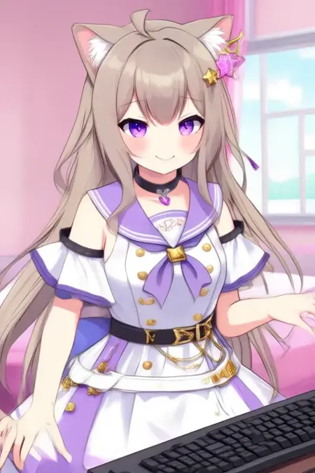 Trigger Word:Yozuna Niu, anime-style girl. The image features an anime-style character with long, light brown hair that is styled in twin tails. The character has large, expressive purple eyes and cat ears on the top of their head, adorned with a small pink star accessory. They are wearing a white and purple outfit with a bow at the chest and gold buttons.and is wearing a white dress with gold buttons and a blue sash tied around the waist. The dress also has a white belt with a gold buckle. The outfit includes a choker with a small purple gem and a belt with a gold buckle.