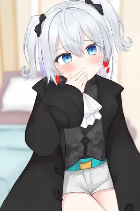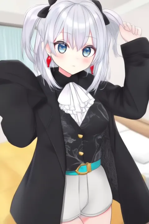 示例提示:Nekomugi Tororo,动漫风格女孩。图像呈现一位动漫风格角色,拥有白色长发,扎成双马尾,用黑色丝带固定。角色拥有大而富有表现力的蓝色眼睛,佩戴红色耳环。身穿黑色高领外套,内搭白色荷叶边衬衫,腰系深青色皮带,配金色扣环。服装还包括一件带有花卉图案的黑色背心和浅色短裤。(她正在跳舞:2.5),(Q版捏捏乐:3.5)在卧室中。