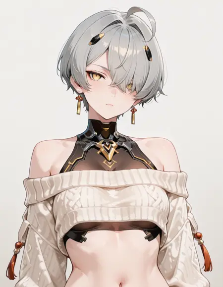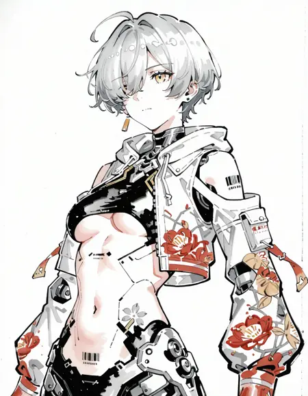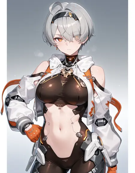 mai_pgr_yata_zy,1girl, solo, breasts, looking_at_viewer, short_hair, navel, standing, jacket, full_body, yellow_eyes, grey_hair, ahoge, hairband, shoes, hair_over_one_eye, orange_eyes, see-through, hand_on_own_hip, clothing_cutout, tattoo, shadow, sneakers, science_fiction, android, joints, cyborg, robot_joints, barcode, mechanical_parts, mechanical_legs, cyberpunk