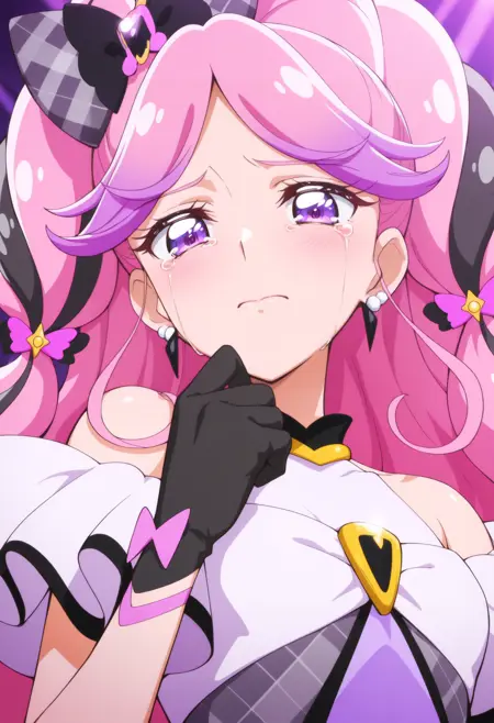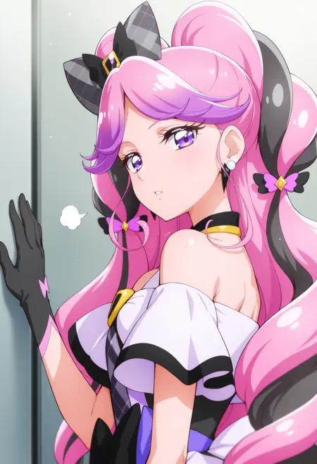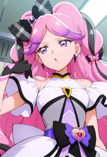 If it's not stable, you can use long hair, curly hair, pink hair, black hair, purple hair, multicolored hair,streaked hair, two-tone hair,purple eyes,magical girl, idol clothes, bare shoulders, gray dress,earrings, hair bow, jewelry, black gloves, hair ornament,thigh boots, black footwear, zettai ryouiki, plaid skirt, layered skirt, please add what you need in the area to assist.