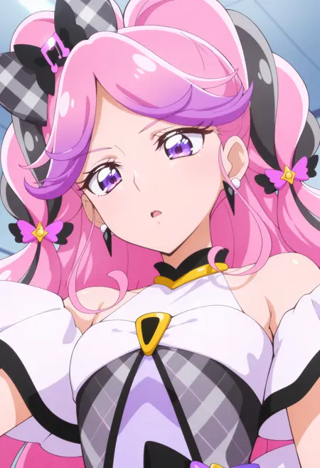 安定しない場合は long hair, curly hair, pink hair, black hair, purple hair, multicolored hair,streaked hair, two-tone hair,purple eyes,magical girl, idol clothes, bare shoulders, grey dress,earrings, hair bow, jewelry, black gloves, hair ornament,thigh boots, black footwear, zettai ryouiki, plaid skirt, layered skirt, 辺りから必要なものを入れて補助して下さい。