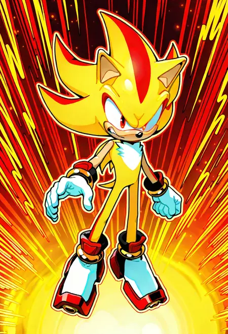 SuperShadow, 1boy, golden yellow fur with bold red accents on quills, intense red eyes, white gloves, gold inhibitor rings, white shoes, sonic the hedgehog