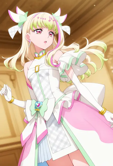 安定しない場合は long hair,green hair, blonde hair, pink hair, streaked hair, two side up, multicolored hair, gradient hair, pink eyes,small breasts,idol clothes, magical girl, white dress, sleeveless dress, asymmetrical clothes, multicolored dress, plaid,hair ornament, earrings, white bow, jewelry, musical note hair ornament,white gloves, elbow gloves, bracelet 辺りから必要なものを入れて補助して下さい。