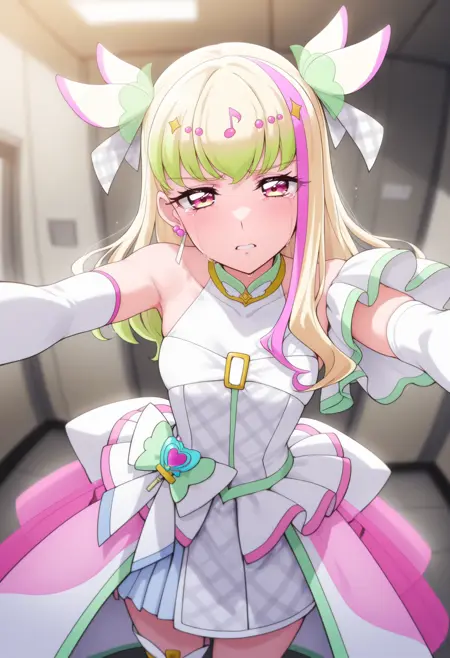 If it is not stable, you can use long hair, green hair, blonde hair, pink hair, streaked hair, two side up, multicolored hair, gradient hair, pink eyes,small breasts,idol clothes, magical girl, white dress, sleeveless dress, bare shoulders, asymmetrical clothes, multicolored dress, plaid,hair ornament, earrings, white bow, jewelry, musical note white bow, jewelry, musical note hair ornament,white gloves, elbow gloves, bracelet