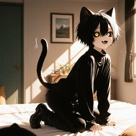 | 训练词汇 | 1boy, catboy, animal ears, cat ears, cat tail, black hair, hair between eyes short hair, sharp teeth, black sclera, black nails, white pupil已复制! fang, long sleeves, turtleneck, black shirt, black pants, black shoes,已复制! simple background, monochrome, greyscale, black and white,已复制! |