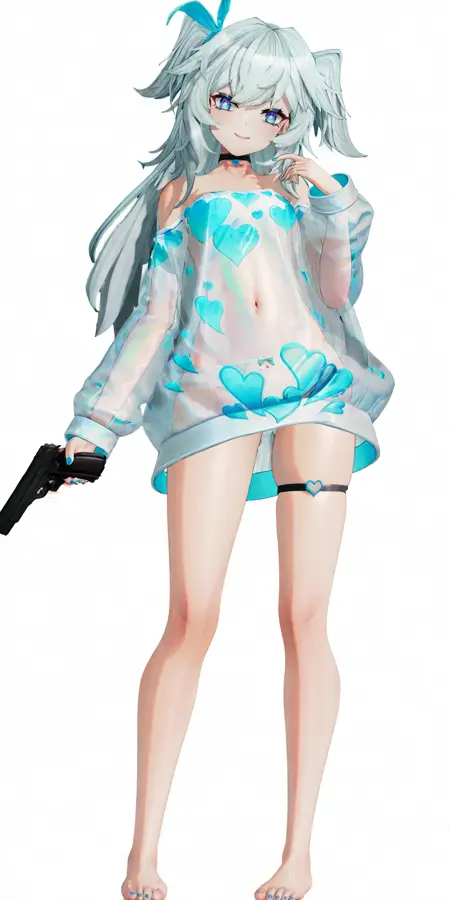 fll,fll def see-through pajamas,official alternate costume,1girl,solo, twintails,bare shoulders,no underwear,white panties, bare legs,barefoot,no pants,thigh strap,choker, nail polish,navel, gun, weapon, holding, handgun, full body, holding weapon, white background,holding gun, simple background, standing, looking at viewer, smile, closed mouth, trigger discipline,
