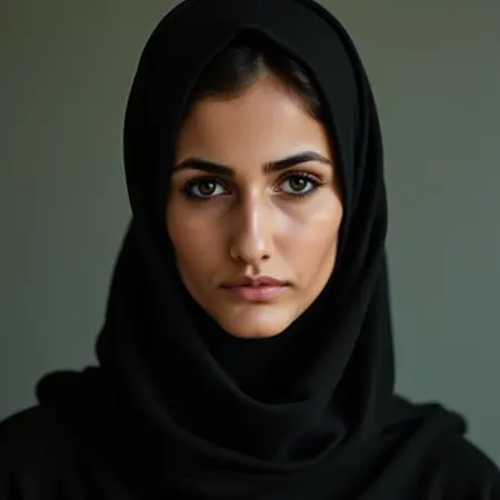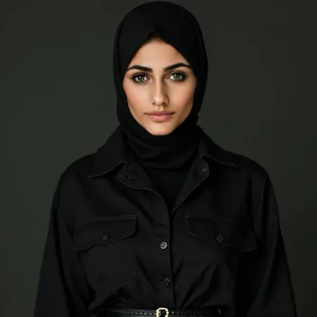 Appearance: Confident and composed; often pairs modern, form-fitting clothes with a black hijab — a visual contradiction that challenges stereotypes rather than conforming to them.