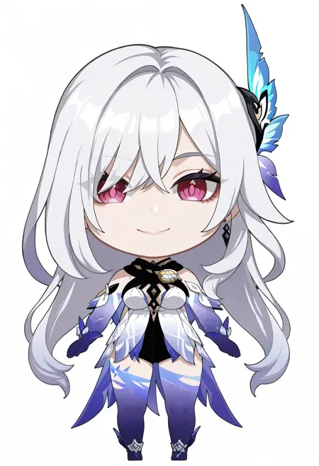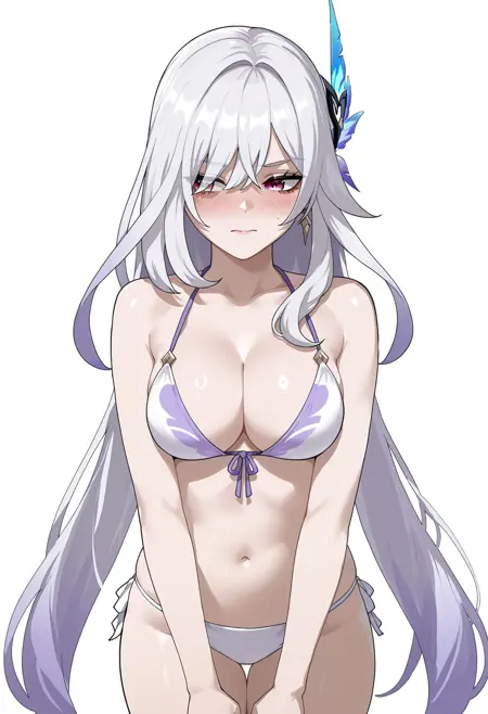 gnshnskrk, genshin impact, skirk \(genshin impact\), hair ornament, pink eyes, white hair, medium breasts, butterfly hair ornament, gradient hair, hair between eyes, hair intakes, very long hair, <lora:genshin_skirk_illustrious:0.8>