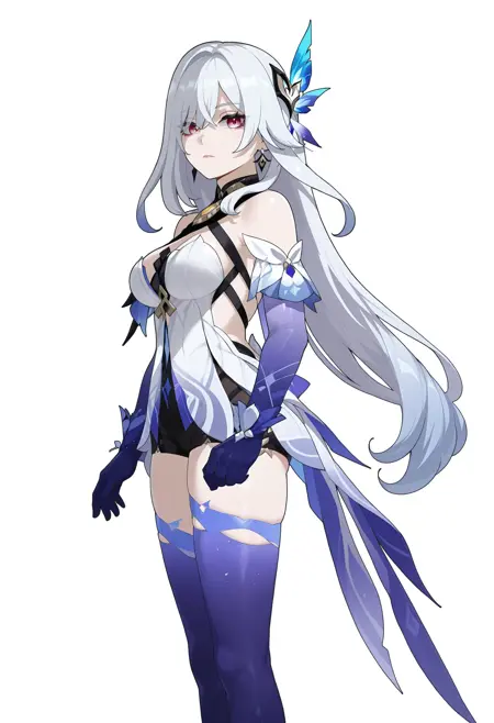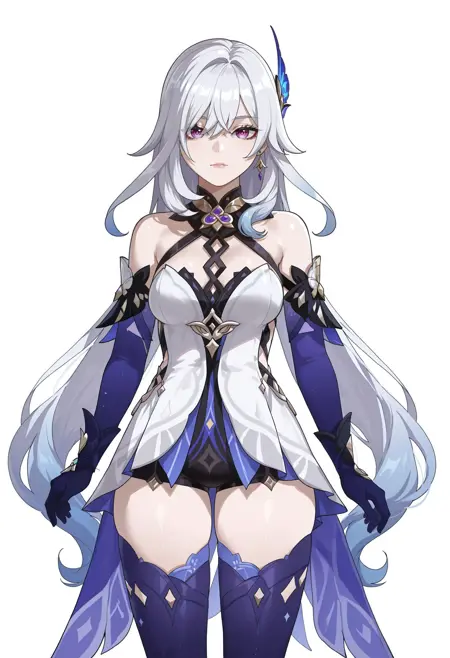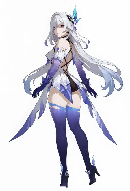 gnshnskrk, genshin impact, skirk \(genshin impact\), hair ornament, pink eyes, white hair, medium breasts, butterfly hair ornament, thighhighs, bare shoulders, dress, elbow gloves, white dress, gradient hair, blue thighhighs, black dress, short dress, hair between eyes, hair intakes, very long hair, <lora:genshin_skirk_illustrious:0.8>