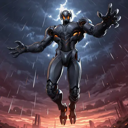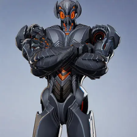 male, solo, humanoid, robot, grey body, orange eyes, claws, 2toes, red accent, orange accent, neon trim