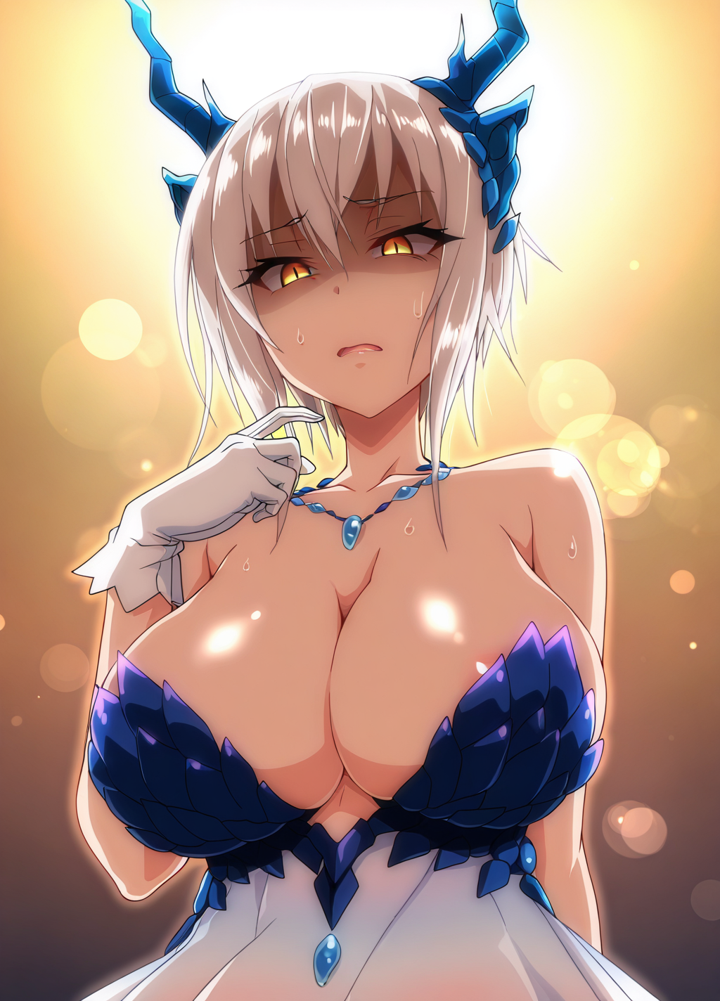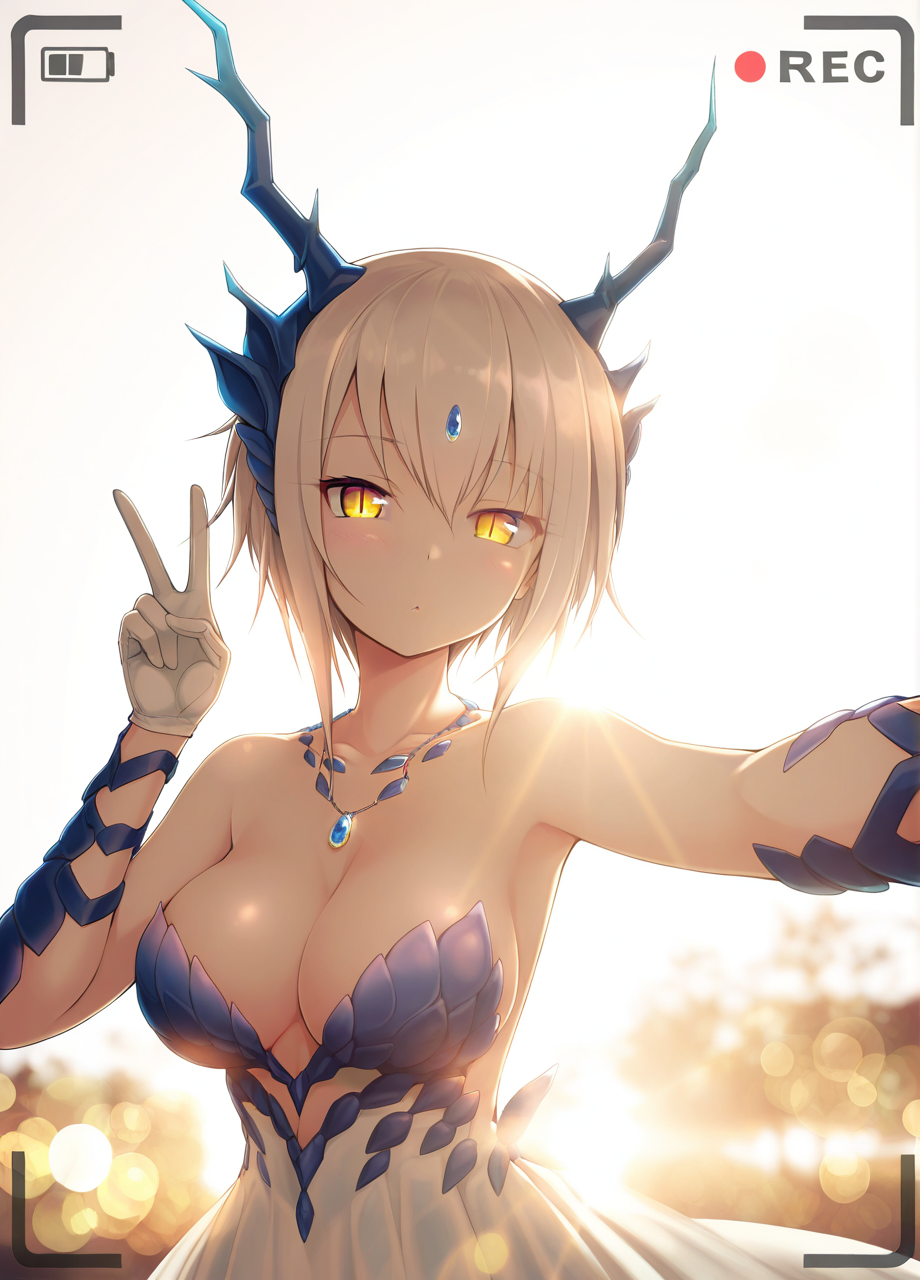 Mizunoe-Dragon, 1girl, breasts, blonde hair, artoria pendragon \(fate\), yellow eyes, artoria pendragon \(lancer alter\) \(fate\), looking at viewer, horns, solo, dress, black background, simple background, armor