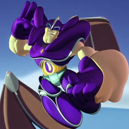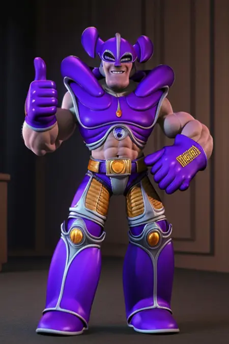 Tags: U_L_JN, purple mask, purple armor, muscular, sleeveless, purple gloves, purple boots. You may need to specify expression to avoid the mouth disappearing under "mask"