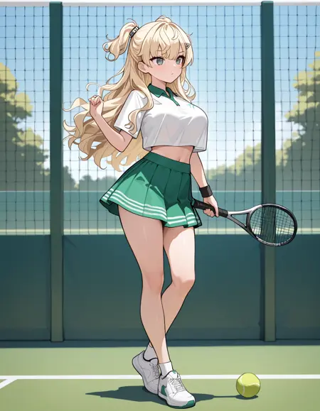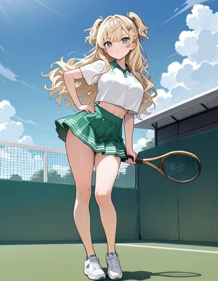 mineapolissport, blonde hair, two side up, white shirt, green skirt, sneakers, midriff