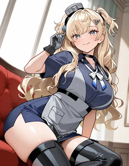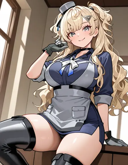 minneapolisdef, grey eyes, blonde hair, blue shirt, black choker, white neck ribbon, grey gloves, grey apron, blue skirt, black thigh boots, grey mini hat,