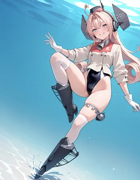 drum_(kancolle), star (symbol), high-leg swimsuit, black swimsuit under clothes, white thighhighs, garrison cap, bell, white gloves, headphones, beige jacket, thigh strap,