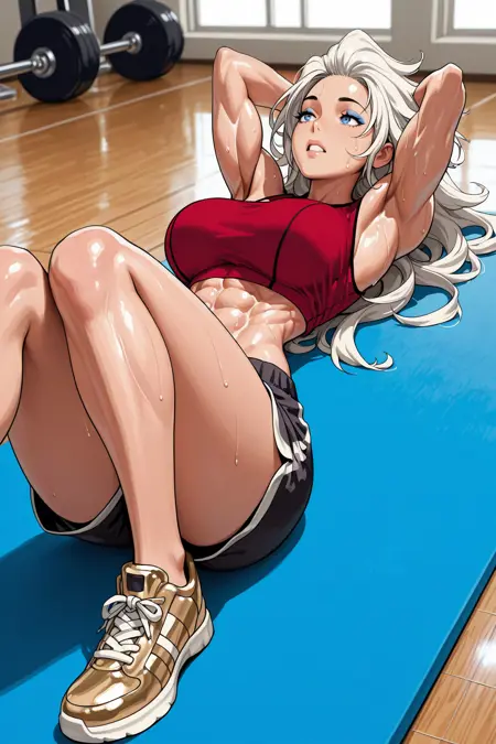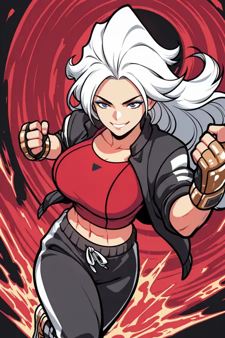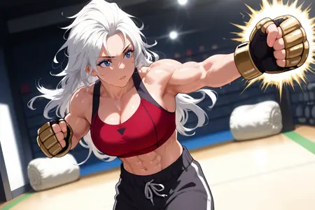 트리거: MarianKelly, 근육질 여자, 복근, 긴 머리, 흰 머리, 파란 눈, 파란 아이섀도우, 검은 재킷, 열린 재킷, 팔걸이 말아올린, 빨간 크롭탑, 복부, 손가락 없는 장갑, 골드 장갑, MMA 장갑, 검은 트랙 팬츠, 골드 스니커즈
