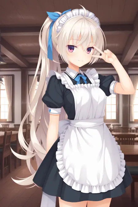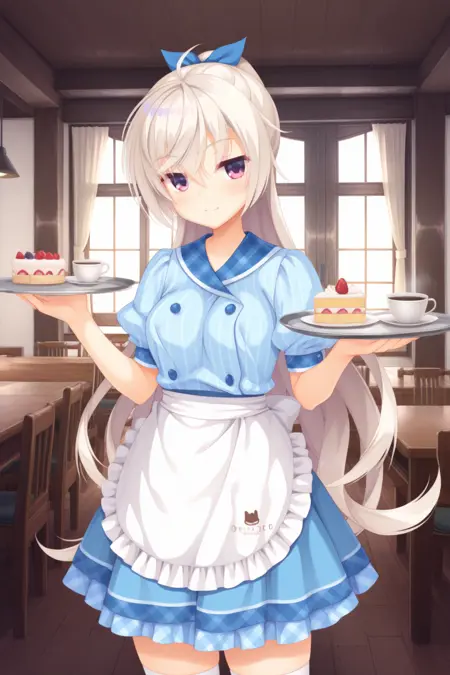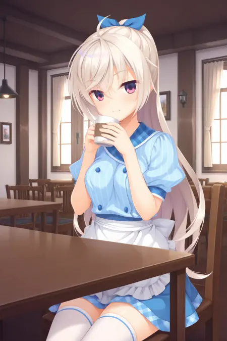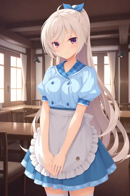 cckanna, ピンクの目, 白髪, ポニーテール, ahoge, kannawork, 青い髪リボン, 青いシャツ, ピンストライプシャツ, フリル付き短い袖, 青いスカート, 白いエプロン, フリル付きエプロン, ウエストエプロン, 白いタイツ,