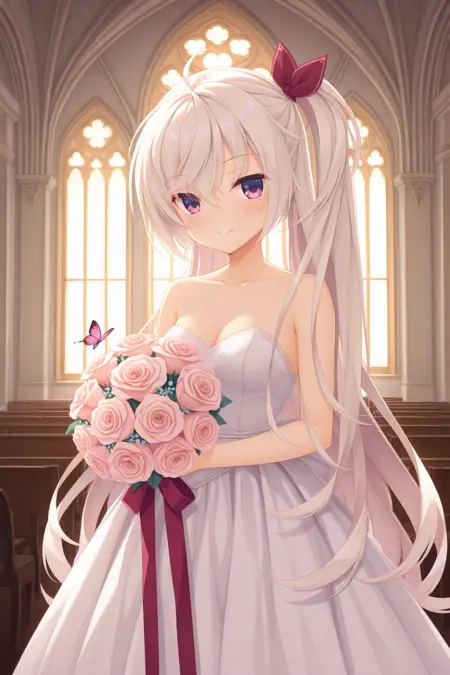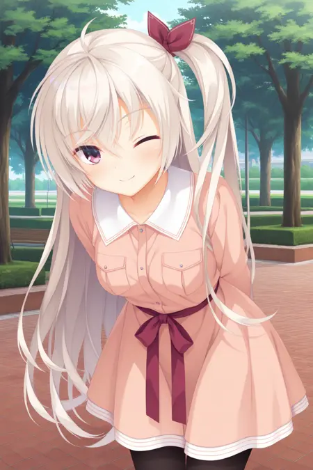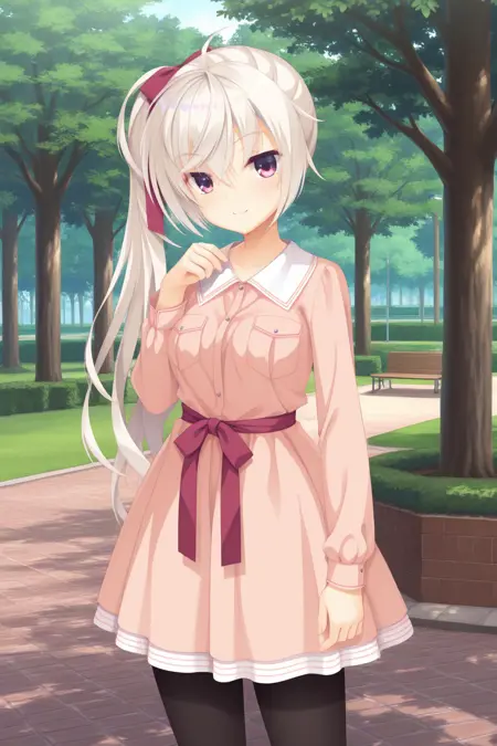 bbkanna, ピンクの目, 白髪, 片側ポニーテール, ahoge, kannacasual, 赤い髪リボン, 白いカラー, ピンクのドレス, カラー付きドレス, 短めのドレス, 長袖, 赤いウエストリボン, 黒いパンティーホース,