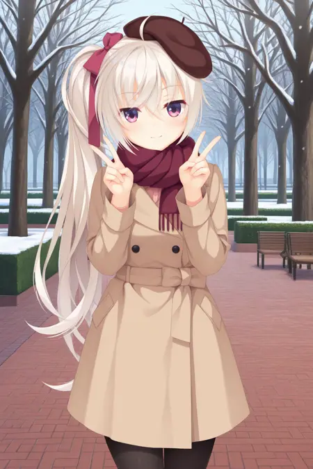 eekanna, ピンクの目, 白髪, 片側ポニーテール, ahoge, kannawinter, ベレー帽, 赤い髪リボン, 赤いマフラー, 茶色のコート, 冬用コート, 黒いパンティーホース,