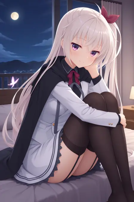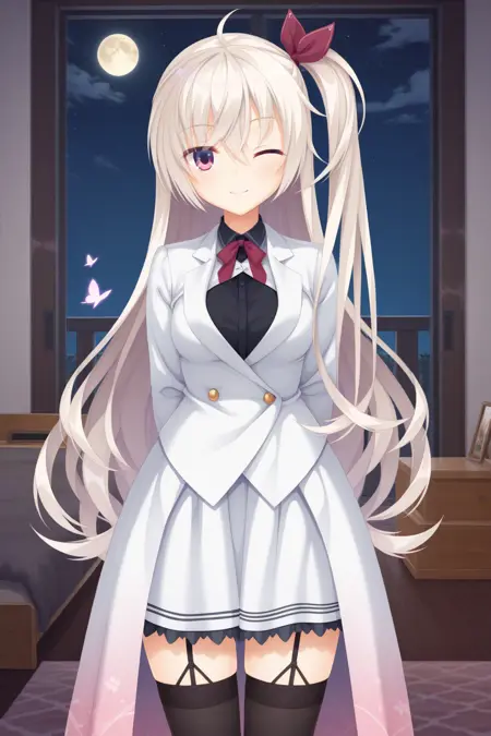 aakanna, ピンクの目, 白髪, 片側ポニーテール, ahoge, kannareaper, 赤い髪リボン, 赤い首リボン, 黒いシャツ, 白いジャケット, 白いスカート, フリル付きスカート, ガーターストラップ, 黒いタイツ, 黒いマント, 灰色のリボン,