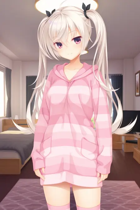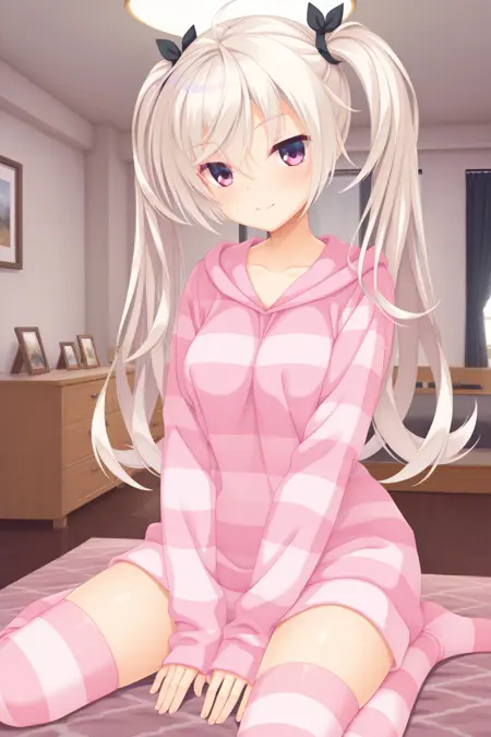 ddkanna, ピンクの目, 白髪, ツインテール, ahoge, kannasleep, 黒い髪リボン, ピンクのセーター, ストライプのセーター, フード付きセーター, フードが下がっている, 袖が手首より長い, ストライプのタイツ,