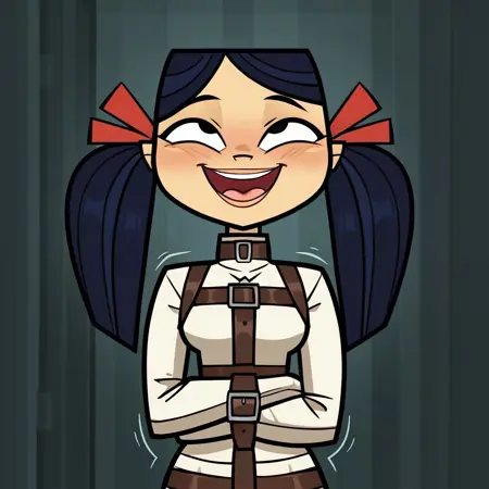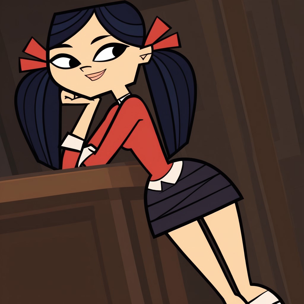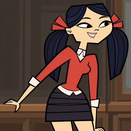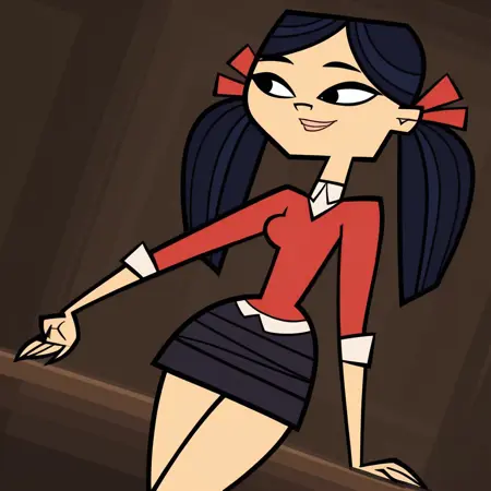kitty tdrr, dark blue hair, red hair ties, long pigtails, black eyes, lips