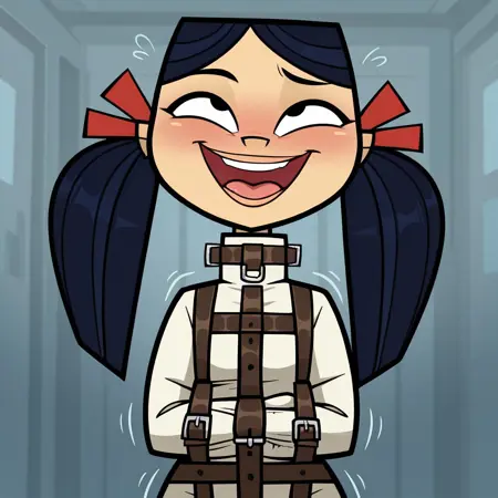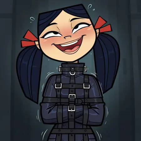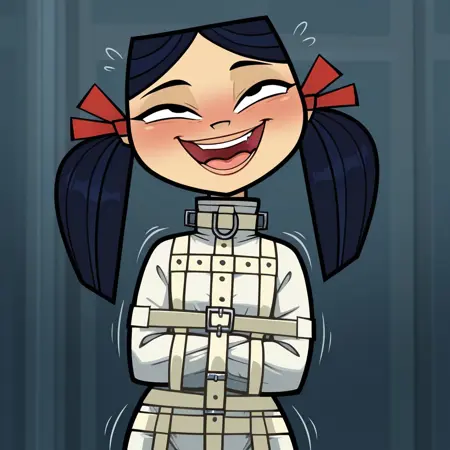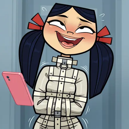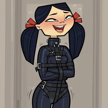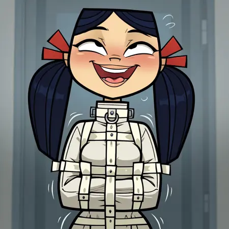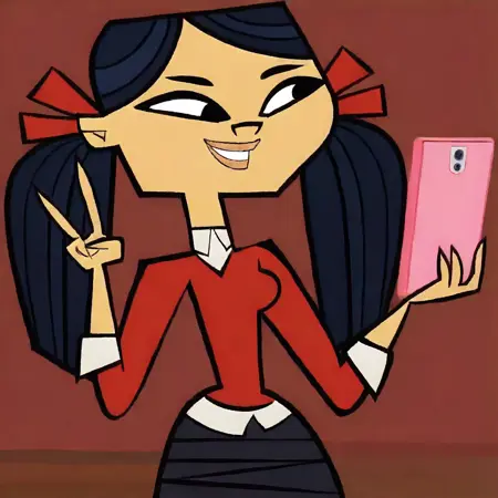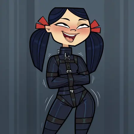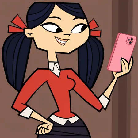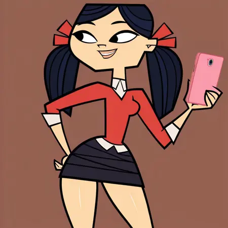 kitty tdrr, dark blue hair, red hair ties, long pigtails, black eyes, lips