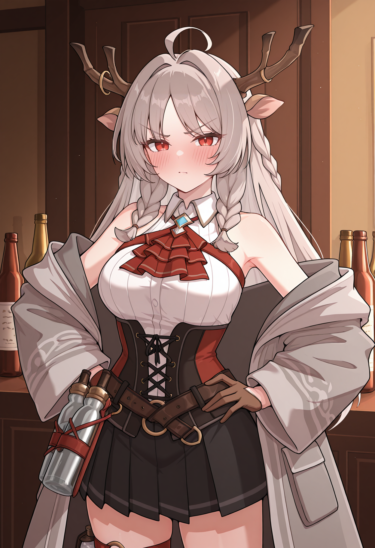 plsmdef, グレーのジャケット, コート, オフショルダー, 開いたジャケット, 袖なし, 肩出し, 白いシャツ, フォーマルシャツ, 赤いアスコット, フリル付きアスコット, 黒いコルセット, 赤いコルセット, 茶色の手袋, 黒いスカート, プリーツスカート, ベルト, ボトル, 太ももストラップ, ショルダーバッグ,