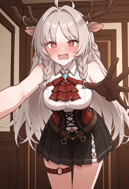 pcrlsmr, 長髪, グレー髪, 茶髪, 髪の流れ, ツインテール, 赤い目, 鹿の耳, 角, 角輪, アホ毛,